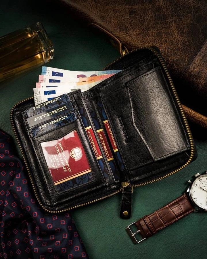 Odszyty bardzo trwale z doskonałej jakości skóry naturalnej. Portfel o klasycznej stylistyce. Model w orientacji pionowej zamykany suwakiem. Bez problemu mieści karty i dokumenty, też te o większym formacie. Wyposażony w system RFID.