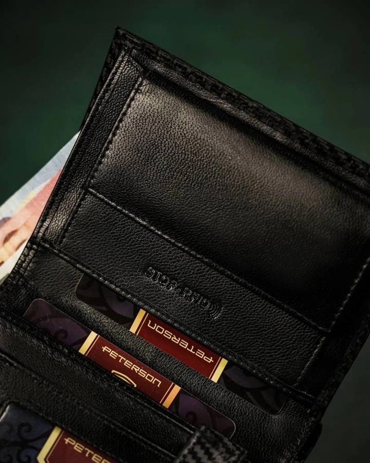 Portfel wykonany z wysokiej jakości skóry naturalnej powleczonej z zewnątrz warstwą przypominającą włókno węglowe (carbon). Model w orientacji pionowej bez zapięcia. Mieści dowód rejestracyjny. Wyposażony w technologię RFID BLOCKING SYSTEM.