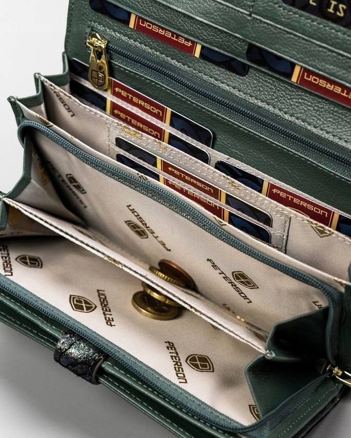 Odszyty ze skóry naturalnej, którego faktura zdobiona jest holograficznymi kwiatkami. Model z maksymalnym poziomem funkcjonalności, dzięki dobrze zorganizowanemu systemowi przegródek i kieszonek. Wyposażony w system RFID.