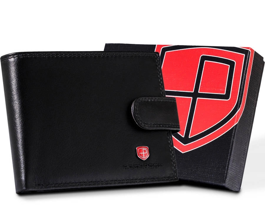 Pojemny portfel męski z wysokojakościowej skóry naturalnej, zamykany zatrzaskiem. Wewnątrz wygodne zakładki na karty oraz przezroczysta kieszonka na dowód rejestracyjny. Klasyczne kieszenie na banknoty oraz zapinana zatrzaskiem sekcja na monety.