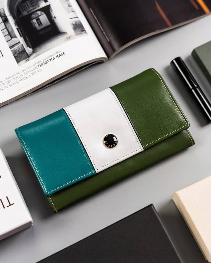 Uszyty z wysokogatunkowej skóry naturalnej cechującej się ponadprzeciętną trwałością. Portfel w ponadczasowym stylu i niespotykanym trójkolorowym wzorze z subtelnym logo na froncie. Posiada dużo praktycznych przegródek i kieszonek.