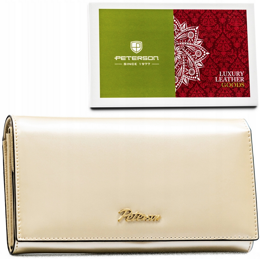 Portfel damski w orientacji poziomej zamykany na zatrzask. Wykonany ze skóry naturalnej. Portfel mieści dowód rejestracyjny i jest wyposażony w system RFID. Sekcja na bilon zamykana zatrzaskiem. Akcesorium zapakowane w firmowe pudełko.