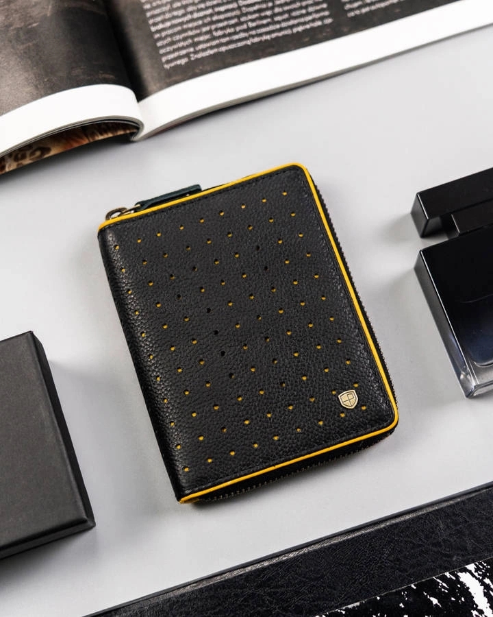 Kompaktowy portfel męski ze skóry naturalnej. Zamykany wygodnym suwakiem. Wyposażony w zakładki na karty i kieszonki na dokumenty, które zmieszczą dowód rejestracyjny. Na banknoty dwie kieszenie, a na bilon przegródka na zatrzask.