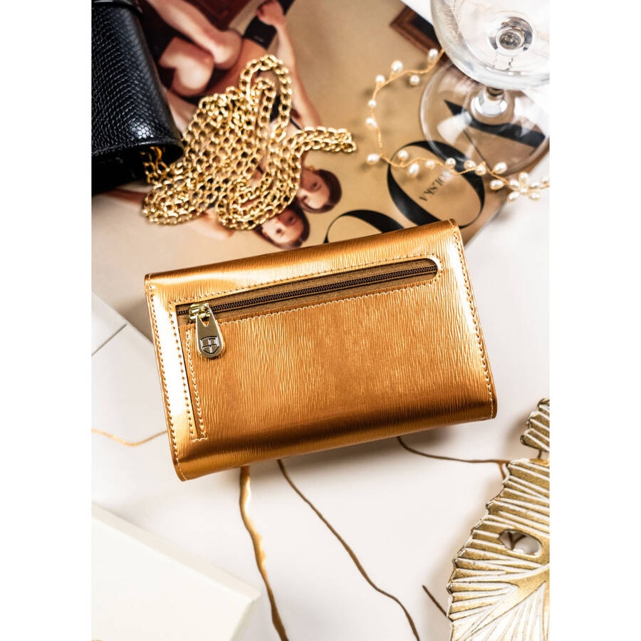 Kompaktowy portfel damski na zatrzask w złotym kolorze. Wykonany z wysokogatunkowej skóry naturalnej w lakierowanym wydaniu. Wewnątrz praktyczne zakładki na karty i dokumenty oraz wygodne sekcje na gotówkę. Akcesorium zapakowane w markowe pudełko.