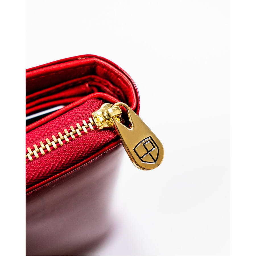Wyjątkowy czerwony portfel wykonany z lakierowanej skóry naturalnej. Wyposażony w 17 przegródek na karty, 4 miejsca na większe dokumenty i 2 przegrody na bilon i banknoty. Zewnętrzne zapięcia na zatrzask i suwak zapewniają bezpieczeństwo i komfort.