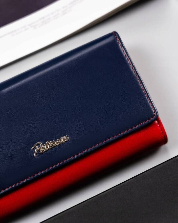 Uszyty ze skóry naturalnej, bardzo trwałej o klasycznie gładkiej fakturze. Model w orientacji poziomej, zamykany zatrzaskiem. Front ozdobiony złotym logo marki. Portfel mieści dużo kart i dokumentów, w tym dowód rejestracyjny. Wyposażony w system RFID.