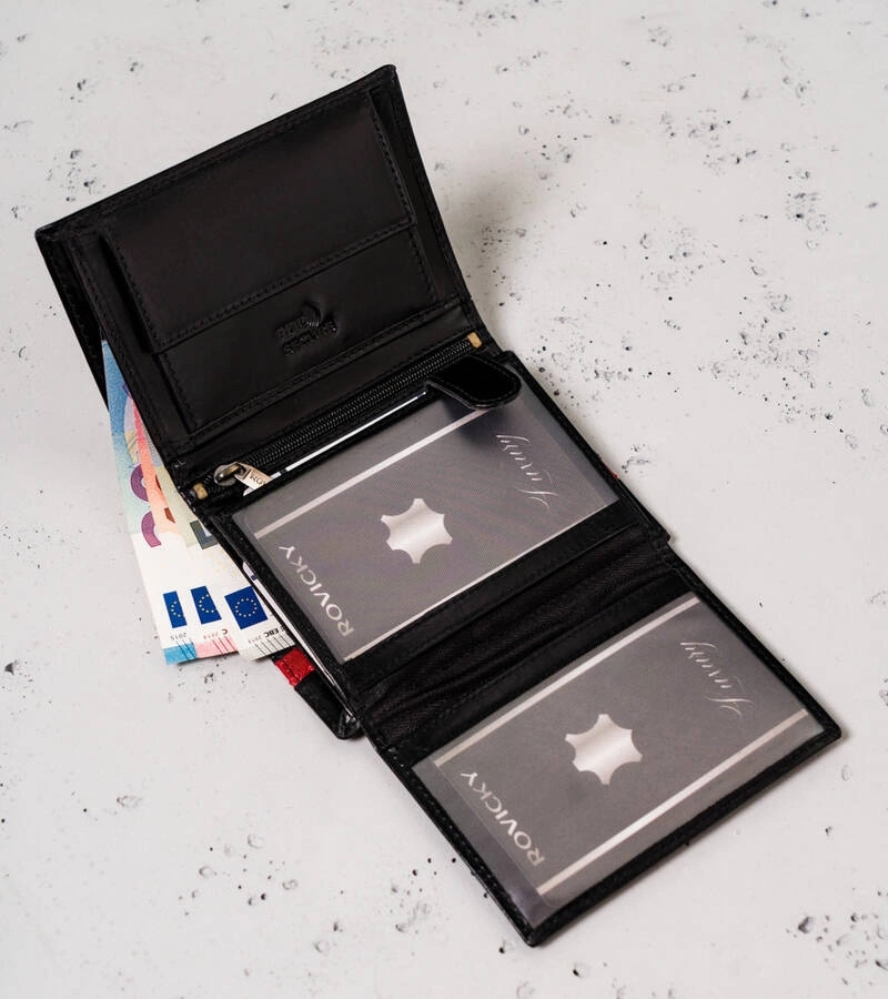 Skórzany, pionowy portfel męski bez zapięcia. Wyposażony w wiele zakładek na karty i kieszenie na dokumenty mieszczące dowód rejestracyjny, podwójną kieszeń na banknoty i przegródkę na bilon zamykaną zatrzaskiem. Dodatkowo schowek zamykany suwakiem.