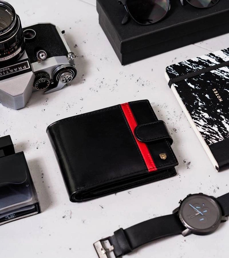 Portfel ze skóry naturalnej. Klasyczny czarny design. Front portfela zdobi elegancki czerwony pasek. Portfel zarówno dla zwolenników gotówki i "wirtualnych pieniędzy". Wyposażony w technologię RFID BLOCKING SYSTEM.