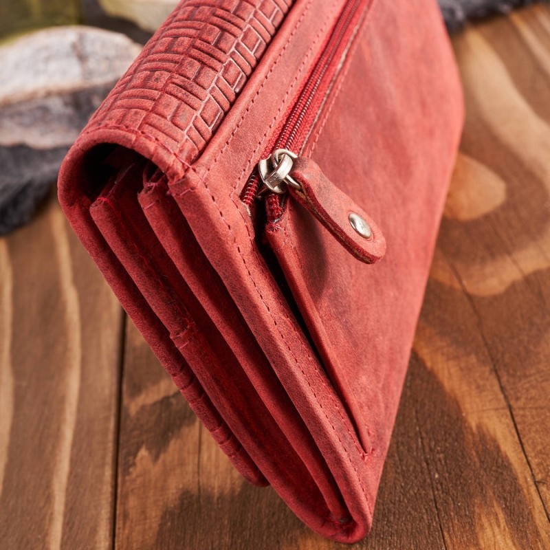 Duży portfel damski został wykonany z solidnej skóry naturalnej hunter, która cechuję się podwyższoną odpornością na użytkowanie. Na froncie portfela znajdują się oryginalne tłoczone wzory geometryczne, które dodają ciekawego charakteru całości. Portfel damski skórzany jest zapinany na solidny zatrzask, a dodatkowo kryje sporą ilość miejsca do przechowywania. Wyposażony jest w dwie przegrody na banknoty oraz jedną pojemna kieszeń na bilon, która jest zapinana na suwak. Wewnątrz portfela damskiego znajdziesz również, 6 przegród na karty kredytowe oraz dwa pojemne schowki na prywatne zapiski lub ważne paragony. Dodatkowo pod frontową klapą portfela umieściliśmy poziomo zapinaną obszerną kieszeń na twoje prywatne zapiski lub bilon. Mało miejsca? To nie wszystko! Z tyłu portfela znajduję się kolejny schowek oraz pojemna kieszeń zapinana na zamek błyskawiczny. W prezentowanym modelu umieściliśmy ochronną warstwę RFID, skutecznie blokującą przesył fal radiowych. Dzięki temu maksymalnie minimalizujemy ryzyko kradzieży poufnych danych zapisanych na elektronicznych nośnikach informacji.