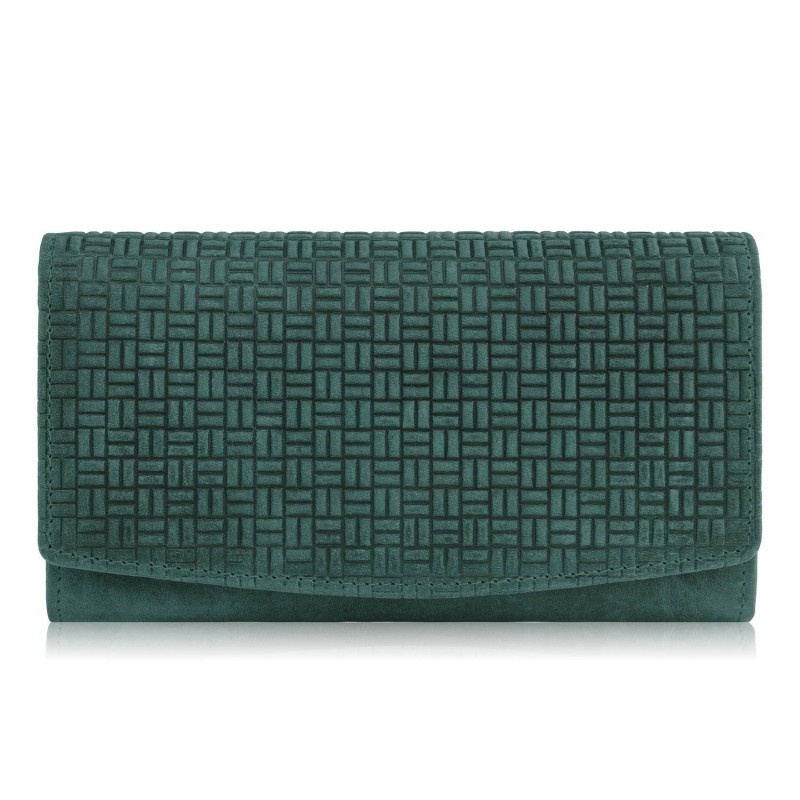 Duży portfel damski został wykonany z solidnej skóry naturalnej hunter, która cechuję się podwyższoną odpornością na użytkowanie. Na froncie portfela znajdują się oryginalne tłoczone wzory geometryczne, które dodają ciekawego charakteru całości. Portfel damski skórzany jest zapinany na solidny zatrzask, a dodatkowo kryje sporą ilość miejsca do przechowywania. Wyposażony jest w dwie przegrody na banknoty oraz jedną pojemna kieszeń na bilon, która jest zapinana na suwak. Wewnątrz portfela damskiego znajdziesz również, 6 przegród na karty kredytowe oraz dwa pojemne schowki na prywatne zapiski lub ważne paragony. Dodatkowo pod frontową klapą portfela umieściliśmy poziomo zapinaną obszerną kieszeń na twoje prywatne zapiski lub bilon. Mało miejsca? To nie wszystko! Z tyłu portfela znajduję się kolejny schowek oraz pojemna kieszeń zapinana na zamek błyskawiczny. W prezentowanym modelu umieściliśmy ochronną warstwę RFID, skutecznie blokującą przesył fal radiowych. Dzięki temu maksymalnie minimalizujemy ryzyko kradzieży poufnych danych zapisanych na elektronicznych nośnikach informacji.