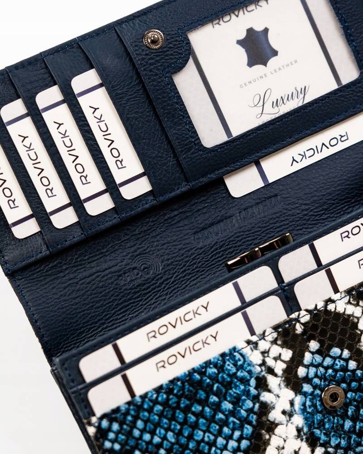 Środek portfela jest wykończony najwyższej jakości skórą naturalną, natomiast zewnętrzna część to najwyższej jakości błyszcząca skóra eko. Portfel wyposażony jest w technologię RFID BLOCKING SYSTEM.