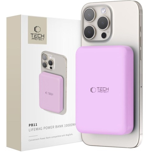 Powerbank z ładowaniem indukcyjnym 10000 mAh 15W, Tech-Protect PB11 LifeMag Urządzenia obsługujące technologię MagSafe   Moc, która zawsze jest przy Tobie Powerbank LifeMag od marki "Tech-Protect" to idealne połączenie funkcjonalności i stylu. Dzięki pojemności 10000 mAh i ładowaniu indukcyjnym 15W, możesz zapomnieć o problemach z rozładowanym telefonem. Ciesz się swobodą bezprzewodowego ładowania w każdym miejscu. Funkcja magnetyczna MagSafe działa tylko i wyłącznie bezpośrednio do telefonu lub do etui z wbudowanym oczkiem magnetycznym o zastosowaniu MagSafe. *Przedmiotem sprzedaży jest sam powerbank, pozostałe akcesoria widoczne na zdjęciach służą jedynie przedstawieniu jego funkcjonalności Kolor producenta: Lilac (fioletowy)     Design, który przyciąga wzrok Stylowy i elegancki kolor powerbanka LifeMag sprawia, że jest on idealnym dodatkiem do każdego urządzenia. Wykonany z wysokiej jakości materiałów ABS i poliwęglanu, gwarantuje nie tylko estetykę, ale także trwałość. Minimalistyczny wygląd w połączeniu z zaawansowaną technologią to znak rozpoznawczy marki Tech-Protect      Bezpieczeństwo przede wszystkim Zadbaj o bezpieczeństwo swoich urządzeń dzięki wbudowanym czujnikom przeciwprzepięciowym, przeciwprzeciążeniowym i przeciwspięciowym. Powerbank LifeMag został zaprojektowany, aby chronić Twoje urządzenia przed wszelkimi zagrożeniami, zapewniając jednocześnie niezawodne i szybkie ładowanie       Wszechstronność i wygoda Powerbank LifeMag wyposażony jest w port USB-C, co pozwala na szybkie uzupełnienie energii nie tylko bezprzewodowo, ale także przy użyciu kabla. Kompatybilność z technologią MagSafe sprawia, że jest idealny dla użytkowników najnowszych modeli iPhone'ów. Niezależnie od tego, czy ładujesz smartfon, tablet, czy inne urządzenia, ten powerbank zawsze dostarcza niezawodnej mocy.   Specyfikacja: Materiał: poliwęglan i ABS Pojemność: 10000mAh Napięcie wejściowe USB-C: 5V/3A, 9V/2A Napięcie wyjściowe USB-C: 5V/3A, 9V/2.2A Moc wyjściowa (bezprzewodowe ładowanie): 5W/7.5W/10W/15W Zestaw zawiera: 1x Powerbank Tech-Protect LifeMag 1x Kabel USB-C (50cm)