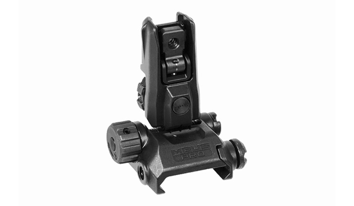 Regulowana w dwóch płaszczyznach szczerbinka systemu MBUS Pro LR (Magpul Back-Up Sight) wyprodukowana ze stali przez Magpul.