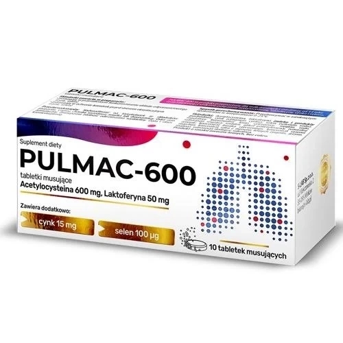 Suplement diety Pulmac-600 uzupełnia codzienną dietę w cynk, selen, laktoferynę oraz acetylocysteinę. Preparat polecany jest jako wsparcie dla układu odpornościowego. Preparat ma postać tabletek musujących o smaku owoców leśnych, nie zawiera cukru.