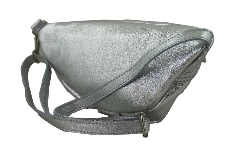 Wnętrze saszetki / nerki: jednokomorowe wnętrze jest wykończone podszewką. Nerka saszetka damska metaliczna posiada kieszeń wewnętrzną zasuwaną mieszczącą np. karty płatnicze lub klucze, wygodnej długości doczepiany pasek z regulacją (maksymalna dł. 100cm, maksymalna wys. 46cm) oraz srebrne okucia i wyróżniające ten model delikatne marszczenie z przodu. Szukasz modnego dodatku niezobowiązującej stylizacji? W naszym sklepie znajdziesz szeroką ofertę wygodnych listonoszek, saszetek oraz plecaków ze skóry naturalnej. Nerka saszetka damska metaliczna to doskonały wybór torebki na każdy dzień.