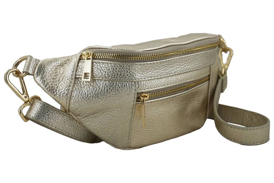 Modna torebka nerka metalizowana złota została wykonana ze skóry naturalnej licowej. W kolekcji galanterii skórzanej oferujemy modne oraz klasyczne dodatki garderoby, które idealnie komponują się ze swobodnymi i niezobowiązującymi stylizacjami. Modna torebka nerka metalizowana to niezastąpiony dodatek garderoby na spotkanie z przyjaciółkami. Nie krępująca ruchów - regulowany pasek umożliwia noszenie torebki nerki wygodnie w pasie lub przewieszonej przez ramię. Wyjątkowe i gustowne torebki skórzane - listonoszki, nerki, klasyczne oraz worki dostępne w naszym sklepie wyróżniają się modnym fasonem, subtelnymi ozdobami oraz solidnym wykonaniem. Dostępna w najnowszej kolekcji modna torebka nerka metalizowana w złotym kolorze podkreśli charakter Twoich stylizacji na wyjątkowe okazje.
