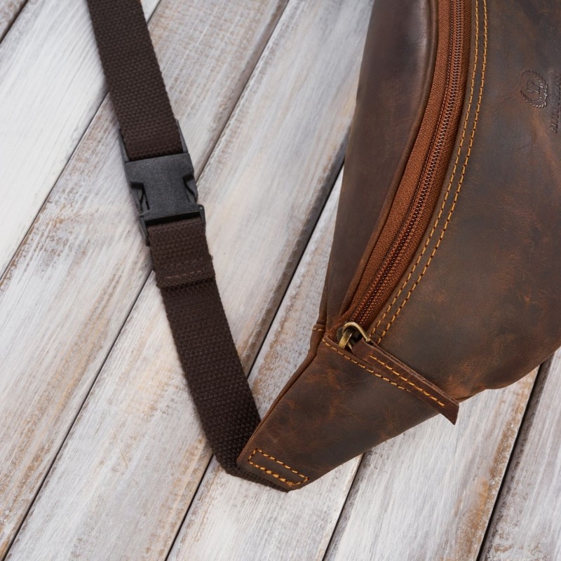 Saszetka na pas została wykonana z postarzanej skóry naturalnej typu hunter. Mocny materiał doskonale sprawdzi się na co dzień, zachowując odporność na przetarcia. Zaletą nerki o prostym fasonie jest pakowna komora główna, w której dodatkowo umieszczono kieszonkę na suwak. Kieszeń wewnętrzna jest idealnym miejscem na przechowywanie drobnych przedmiotów, np. kluczy. Saszetkę nerkę możesz z powodzeniem założyć na skos lub na pas – regulowany, parciany pasek o max. długości 90 cm jest zapinany na mocną klamrę.