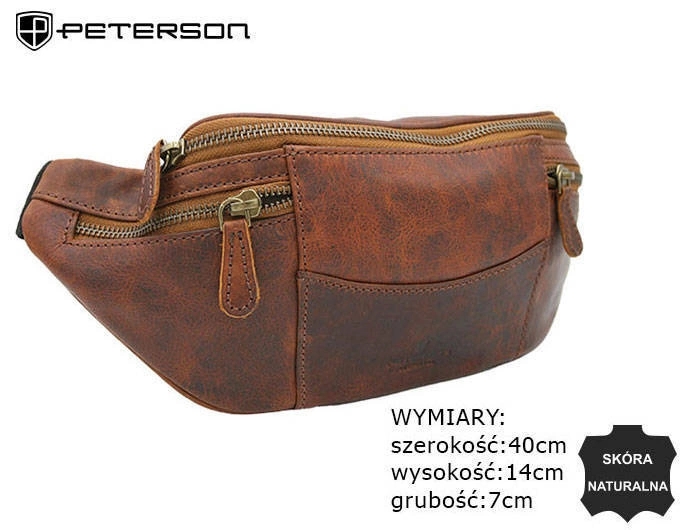 Odszyta ze skóry naturalnej. Nerka zakładana na biodra lub przez ramię. Saszetka jednokomorowa, zapinana solidnymi zamkami błyskawicznymi. Na froncie wyszyto dwie małe kieszonki, z tyłu dodatkowo jedną kieszeń na suwak. Zawieszona na parcianym pasku.