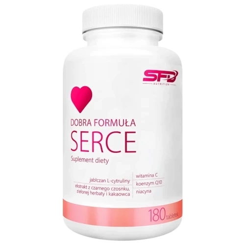 SFD Dobra Formuła Serce to suplement diety, który jest rekomendowany dla osób chcących zadbać o swoje serce. Preparat uzupełnia codzienną dietę w L-cytrulinę, koenzym Q10, niacynę, witaminę C, ekstrakty z czarnego czosnku, zielonej herbaty, kakaowca.