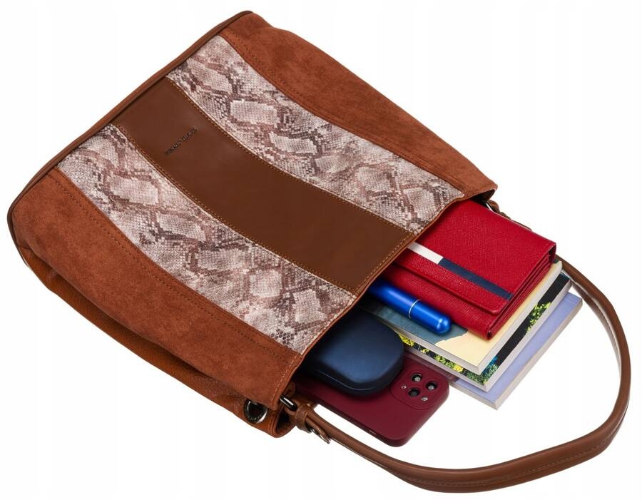 Torebka wykonana jest ze skóry ekologicznej z ozdobnymi wstawkami na przednim panelu - dwoma o wzorze przypominającym skórę węża i dwoma z eko zamszu. Jednokomorowa. Wewnątrz 3 kieszonki, na zewnątrz 1.