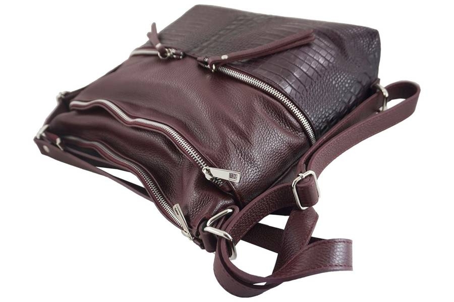 Wnętrze torebki/plecaka: jednokomorowe wnętrze jest wykończone podszewką. Wewnątrz wyodrębniono kieszeń zasuwaną oraz miejsce na telefon. Torebka skórzana damska - worek / plecak A4 posiada srebrne okucia, jest zasuwana, może być noszona na dwa sposoby - jako worek na ramię lub wygodny i funkcjonalny plecak. Na zewnątrz znajdują się cztery kieszenie: z tyłu kieszeń zasuwana; z przodu duża kieszeń na zatrzask, średnia zasuwana oraz dwie małe zasuwane ozdobione skórą z motywem zwierzęcym oraz skórzanymi paseczkami przy suwakach. Uchwyty są regulowane - maksymalna dł. 74cm, maksymalna wys. 33cm (noszona jako worek); maksymalna dł. 70cm, maksymalna wys. 47cm (noszona jako plecak). Usztywniony spód posiada metalowe stopki chroniące przed otarciem.