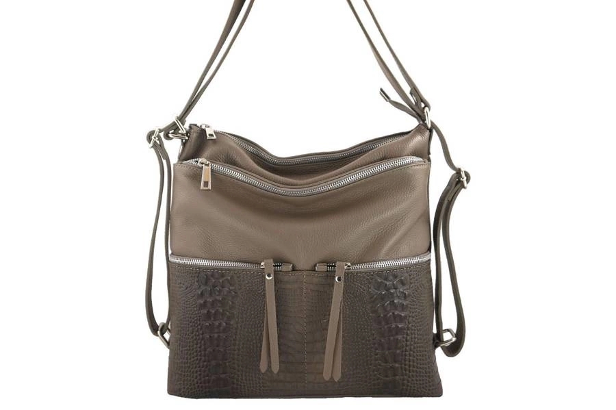 Wnętrze torebki/plecaka: jednokomorowe wnętrze jest wykończone podszewką. Wewnątrz wyodrębniono kieszeń zasuwaną oraz miejsce na telefon. Torebka skórzana damska - worek / plecak A4 posiada srebrne okucia, jest zasuwana, może być noszona na dwa sposoby - jako worek na ramię lub wygodny i funkcjonalny plecak. Na zewnątrz znajdują się cztery kieszenie: z tyłu kieszeń zasuwana; z przodu duża kieszeń na zatrzask, średnia zasuwana oraz dwie małe zasuwane ozdobione skórą z motywem zwierzęcym oraz skórzanymi paseczkami przy suwakach. Uchwyty są regulowane - maksymalna dł. 74cm, maksymalna wys. 33cm (noszona jako worek); maksymalna dł. 70cm, maksymalna wys. 47cm (noszona jako plecak). Usztywniony spód posiada metalowe stopki chroniące przed otarciem.
