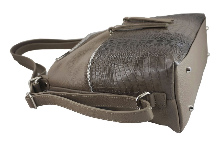 Wnętrze torebki/plecaka: jednokomorowe wnętrze jest wykończone podszewką. Wewnątrz wyodrębniono kieszeń zasuwaną oraz miejsce na telefon. Torebka skórzana damska - worek / plecak A4 posiada srebrne okucia, jest zasuwana, może być noszona na dwa sposoby - jako worek na ramię lub wygodny i funkcjonalny plecak. Na zewnątrz znajdują się cztery kieszenie: z tyłu kieszeń zasuwana; z przodu duża kieszeń na zatrzask, średnia zasuwana oraz dwie małe zasuwane ozdobione skórą z motywem zwierzęcym oraz skórzanymi paseczkami przy suwakach. Uchwyty są regulowane - maksymalna dł. 74cm, maksymalna wys. 33cm (noszona jako worek); maksymalna dł. 70cm, maksymalna wys. 47cm (noszona jako plecak). Usztywniony spód posiada metalowe stopki chroniące przed otarciem.
