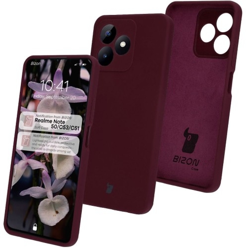 Silikonowe etui Bizon Soft CaseRealme Note 50Realme C53Realme C51 Miękka ochrona dla Realme Note 50 / Realme C53 / Realme C51Ładne czy mocne? Tym razem nie musisz wybierać!Silikonowe etui marki Bizon z serii Soft Case zostało stworzone z myślą o osobach ceniących sobie zarówno ochronę, jak i wygląd. Wyrazisty i mocny silikon ochroni Twojego smartfona przed zabrudzeniami, a poliwęglanowe wzmocnienie zminimalizuje czasem tragiczne skutki grawitacji.Wykonane z płynnego silikonuChroni przed zabrudzeniami oraz amortyzuje w razie wstrząsówPodwyższone krawędzieDedykowane wycięcia na obiektywyZintegrowane osłony na przyciskiKompatybilność z ładowaniem indukcyjnym - dotyczy modeli wyposażonych w tę funkcjęKolor producenta: Plum (śliwkowy)Etui kompatybilne ze szkłami* o wymiarach mniejszych niż (dług./szer.): 16,52 x 7,49 cm* Nie wiesz, jakie szkło będzie pasować? Wybierz Bizon Glass Clear!Przedmiotem sprzedaży jest samo etui, pozostałe akcesoria widoczne na zdjęciach służą jedynie przedstawieniu jego funkcjonalności. Solidna konstrukcjaBoisz się, że po założeniu etui, smartfon zacznie sam klikać, a kiedy Ty będziesz chciał zwiększyć głośność, to strzeli na Ciebie focha i zamiast tego się wyłączy? Tak jest tylko na filmach. A Bizon Soft Case, oprócz przemyślanej konstrukcji z połączenia płynnego silikonu i poliwęglanu, cechuje się utrzymaną płynnością działania przycisków, które dodatkowo są zabezpieczone zintegrowanymi osłonami! Podwyższone krawędzie i ukryta w środku etui mikrofibra dodatkowo zabezpieczą ekran i urządzenie w razie upadku.  Aparat w pełni bezpieczeństwaDedykowane wycięcia na obiektywy w połączeniu z podwyższonymi krawędziami dodatkowo zabezpieczą soczewki na płaskiej powierzchni, dzięki czemu Twój aparat będzie chroniony przed niechcianymi zarysowaniami! Kolor, który dobrze się nosiZa górami, za lasami, gdzieś na strychu, rzucone w kąt leży nie tak dawno kupione, wypłowiałe etui, które z niegdyś wyrazistym kolorem nie ma już nic wspólnego...To nie jest scenariusz dla Soft Case'a! Silikon, z którego został wykonany, zapewnia nie tylko zwiększoną odporność na odciski palców, ale także powierzchnię o gładkim i przyjemnym dotyku. Zastosowany materiał jest także niezwykle trwały i odporny na utratę koloru, a w razie ubrudzenia etui z łatwością je wyczyścisz, bez obaw o wyblaknięcie!Zdjęcie poglądowe, produkt może się różnić w zależności od modelu urządzenia Pełna funkcjonalnośćEtui jest idealnie dopasowane do telefonu, a niewielka grubość pozwala na indukcyjne ładowanie bez potrzeby ściągania obudowy (tylko jeśli Twój telefon potrafi się ładować bezprzewodowo). Pokrowiec posiada wszelkie niezbędne wycięcia, dzięki którym możesz cieszyć się pełnym dostępem do portów.