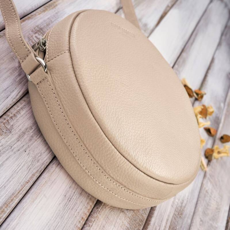 Okrągła torebka na ramię została wykonana z wysokojakościowej skóry naturalnej groszkowej. Posiada ona pakowną komorę główną zapinaną na zamek błyskawiczny. Wewnątrz torebka wyłożona jest solidną podszewką. W środku znajdują się dwie kieszenie. Jedna kieszonka wykonana ze skóry naturalnej, dedykowana na karty lub wizytówki. Druga kieszeń wsuwka. Pasek na ramię w tym modelu został połączony w niebanalny i elegancki sposób. Łączy się na poziomie zamka błyskawicznego za pomocą metalowego, srebrnego kółeczka z ozdobnym paseczkiem, który okala całą torebkę. Akcesorium galanteryjne w kolorze beżowy będzie rozjaśniać twoje stylizację, nie tylko w okresie letnim.