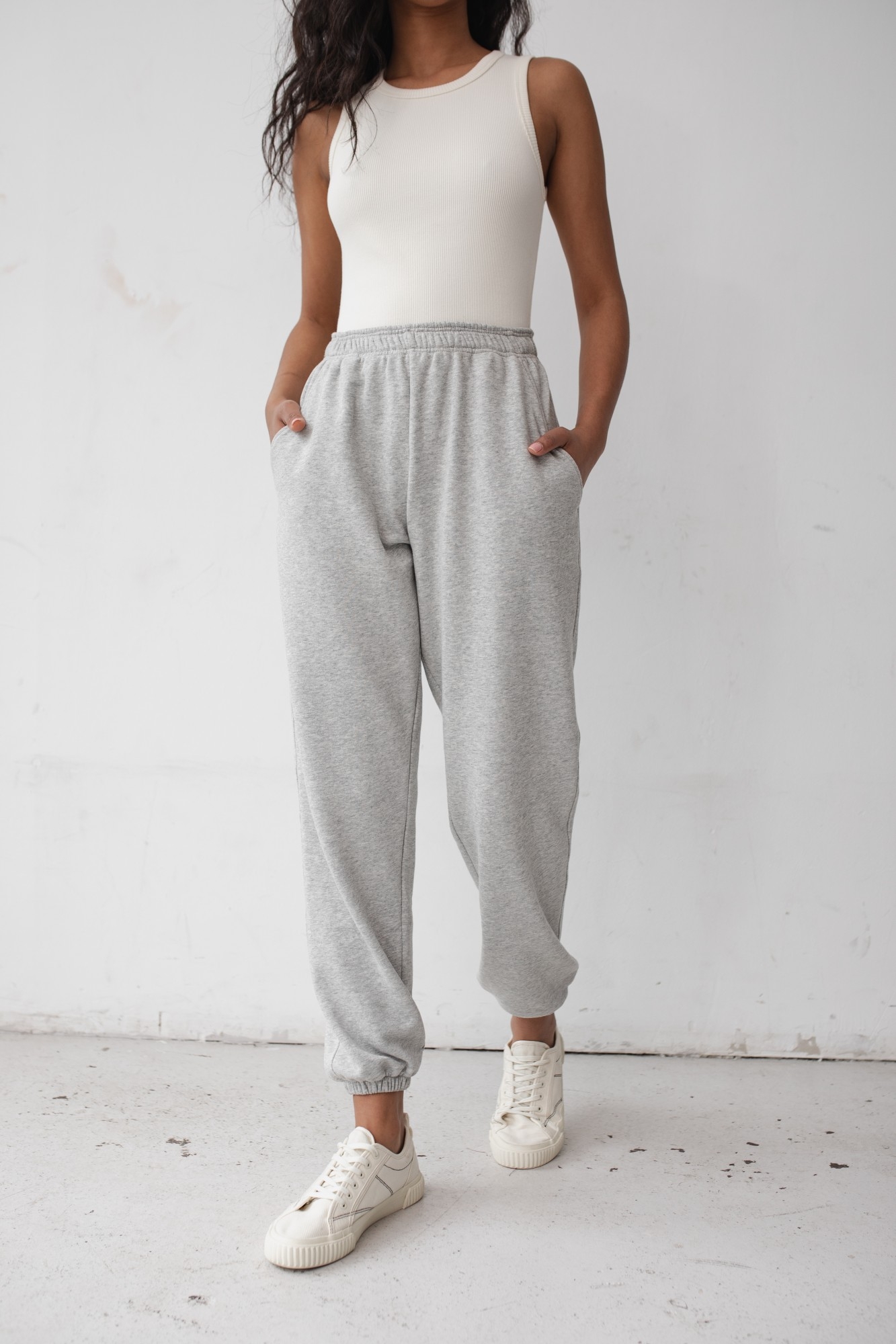 Joggery damskie wykonane z dzianiny dresowej w kolorze jasnoszarym Spodnie o luźnym kroju, z wysokim stanem oraz charakterystycznym wykończeniem nogawek. W pasie znajduje się guma. Przód został urozmaicony o dwie kieszenie. Kojarzone z miejskim luzem, świetnie sprawdzą się również w nieco bardziej wyszukanych zestawach - nawet w wersji elegant. Perfekcyjnie tuszują wszelkie niedoskonałości sylwetki i gwarantują maksymalny komfort podczas noszenia! Połączysz je zarówno ze zwykłym t-shirtem, jak i bluzą, czy dopasowanym topem. Modelka ma 174 cm wzrostu i prezentuje rozmiar S Skład: 80% Bawełna, 20% Poliester PRODUKT POLSKI - Marsala Collection ZALECANA PIELĘGNACJA: