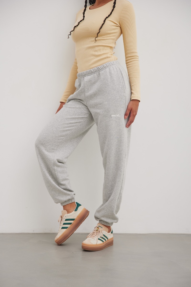 Joggery damskie wykonane z dzianiny w kolorze szarym z efektem melanżu. . Spodnie o luźnym kroju, oraz szerokimi nogawkami wykończonymi gumą. Na lewej nogawce minimalistyczny haft MRSL w kolorze dzianiny. Jeden z modeli, które pozwalają na tworzenie wygodnych i bardzo modnych w ostatnich sezonach stylówek. Kojarzone z miejskim luzem, świetnie sprawdzą się również w nieco bardziej wyszukanych zestawach. Perfekcyjnie tuszują wszelkie niedoskonałości sylwetki i gwarantują maksymalny komfort podczas noszenia! Dostępne rónież w innym kolorze. Skład: 80% Bawełna, 20% Poliester Gramatura dzianiny : 320g/ m²