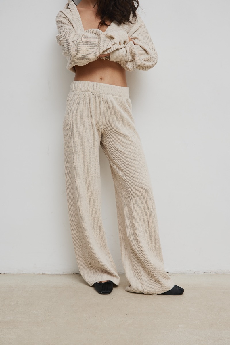 Długie spodnie o prostym kroju wykonane z plisowanej bawełny w kolorze beżowym. . Model wykonany z miękkiej bawełny . Nogawki proste , w pasie wszyta gumka, co pozwoli na idealne dopasowanie się spodni do sylwetki. Fason z wyższym stanem, stanowi jeden z najnowszych trendów sezonu. Bardzo korzystnie wpływają na sylwetkę - optycznie wydłużają nogi, podkreślają talię. Stanowią nowoczesną wersję klasycznych, eleganckich spodni damskich. Stworzysz idealny look na lato łącząc spodnie z dostępnymi w ofercie koszulą NELSON oraz z szortami SHELLY w tym samym kolorze. Skład: 100 % Bawełna ZALECANA PIELĘGNACJA: Wirować na niskich obrotach .