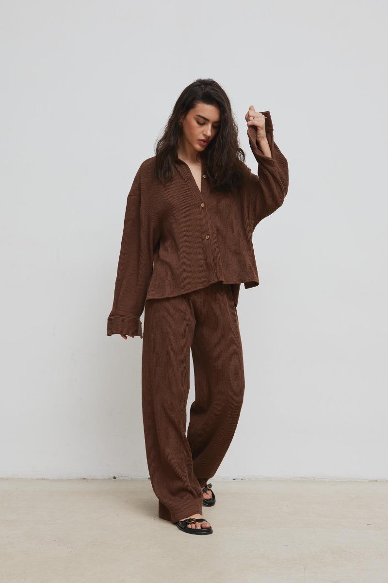 Długie spodnie o prostym kroju wykonane z plisowanej bawełny w kolorze brązowym. . Model wykonany z miękkiej bawełny . Nogawki proste , w pasie wszyta gumka, co pozwoli na idealne dopasowanie się spodni do sylwetki. Fason z wyższym stanem, stanowi jeden z najnowszych trendów sezonu. Bardzo korzystnie wpływają na sylwetkę - optycznie wydłużają nogi, podkreślają talię. Stanowią nowoczesną wersję klasycznych, eleganckich spodni damskich. Stworzysz idealny look na lato łącząc spodnie z dostępną w ofercie koszulą NELSON. Skład: 100 % Bawełna ZALECANA PIELĘGNACJA: