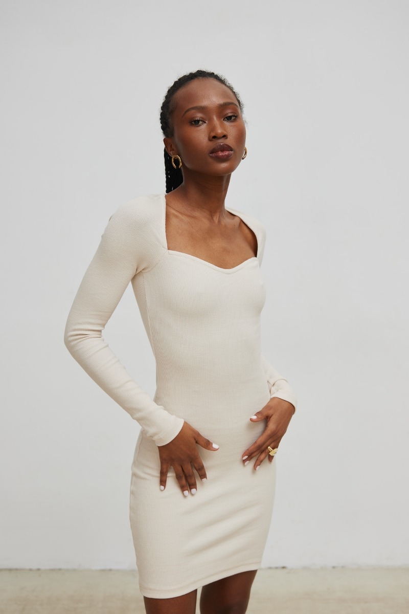 Sukienka typu bodycon wykonana z dzianiny prążkowanej w odcieniu jasnobeżowym Model o długości mini, z długim, dopasowanym rękawem. Niezwykle kobieca propozycja - dopasowuje się do sylwetki, podkreśla kobiece kształty, a zastosowany rodzaj dekoltu dodatkowo eksponuje biust i przykuwa uwagę. Może stanowić świetną bazę do stworzenia wielu ponadczasowych stylizacji, idealnych na imprezę, randkę, czy wieczór na mieście. Fason ten sprawdzi się u tych kobiet, które lubią swoje ciało niezależnie od wymiarów i mają odwagę nosić seksowne, podkreślające kobiecość ubrania. Dostępna również w kolorze black oraz beige UWAGA - wymiary mierzone na płasko; materiał charakteryzuje się dużą elastycznością Modelka ma 173 cm wzrostu i prezentuje rozmiar XS/S Skład: 95% Bawełna, 5% Elastan PRODUKT POLSKI - Marsala Collection ZALECANA PIELĘGNACJA: