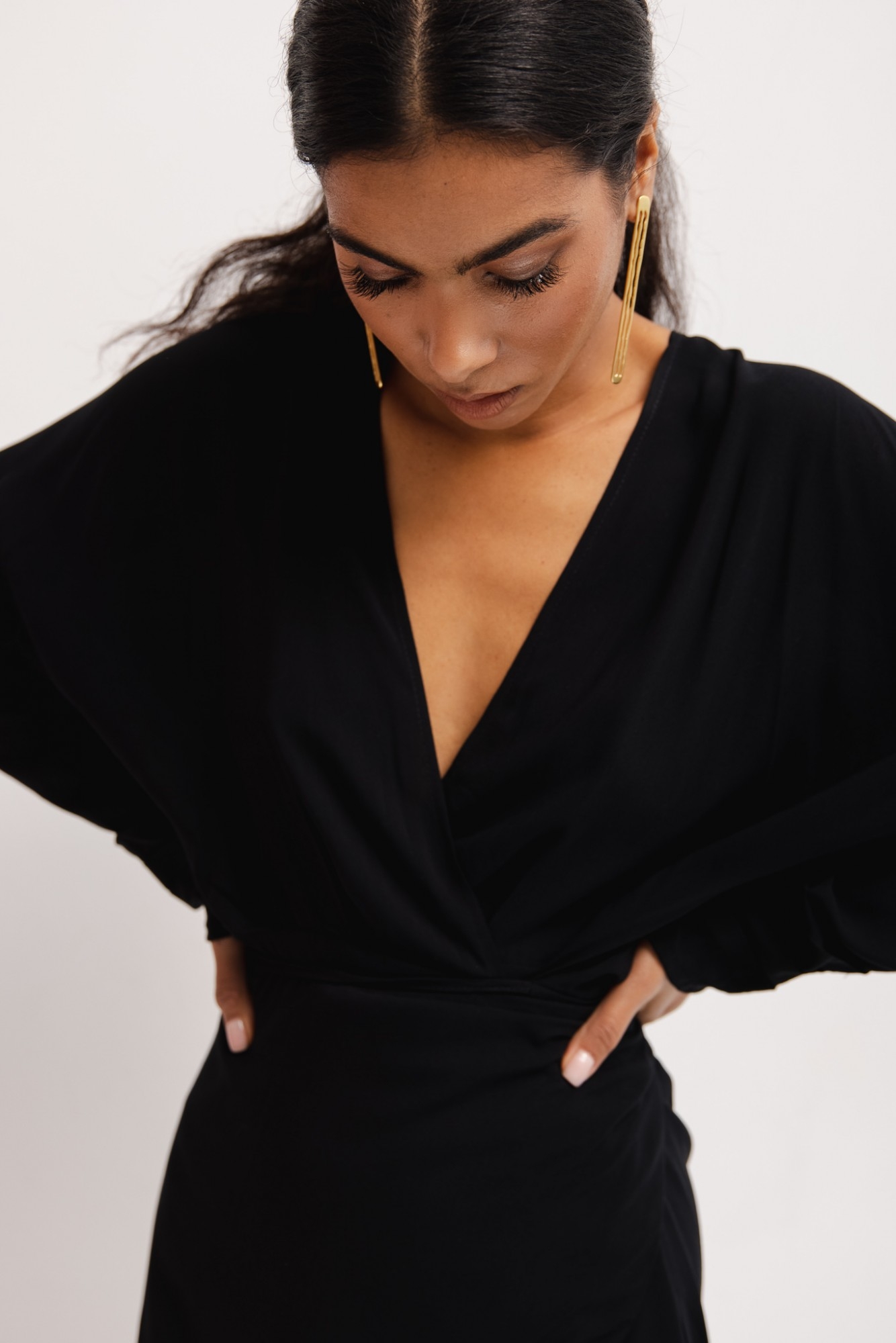 Sukienka na zakładkę , wykonana z wiskozy w kolorze czarnym . Ten model to niezwykle lekka konstrukcja. Góra sukienki to dekolt w kształcie litery V , oraz długie rękawy wykończone oryginalnym drapowaniem . Dolna część sukienki to spódnica zapinana na zakładkę , oraz jej druga część wiązana na boku. Dzięki temu mocowaniu sukienka jest idealnie dopasowana w talii. Wysokiej jakości materiał z matowym wykończeniem nadaje jej ekskluzywnego charakteru. Modelka ma 174 cm wzrostu i prezentuje rozmiar S Skład: 100% Wiskoza PRODUKT POLSKI - Marsala Collection ZALECANA PIELĘGNACJA: