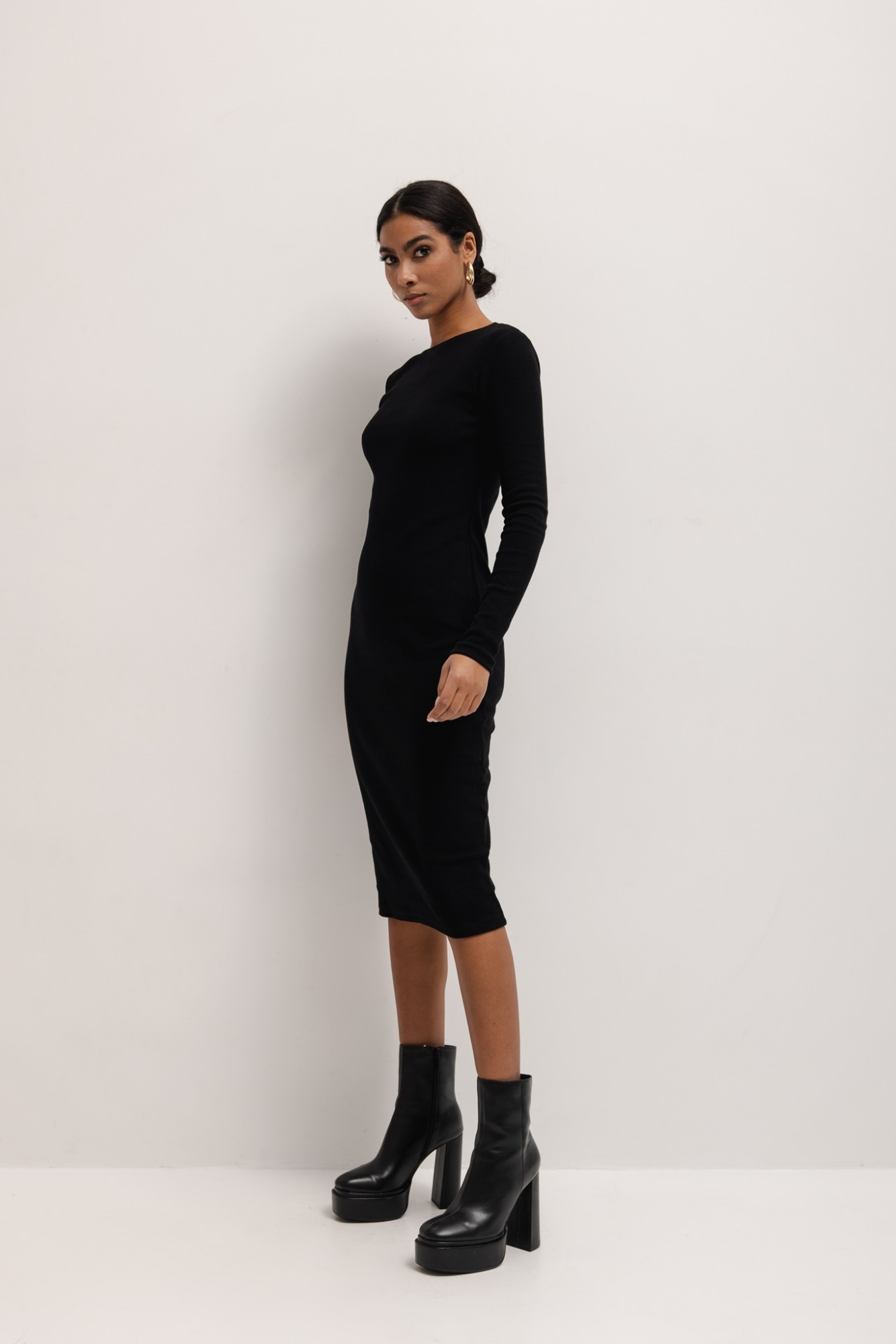 Sukienka bawełniana w kolorze czarnym . Bawełna o gramaturze 290g. Model z długim rękawem i niewielkim okrągłym dekoltem. Minimalistyczna forma w wydaniu midi, przykuwa uwagę i pozwala każdej kobiecie poczuć się wyjątkowo! Doskonale dopasowuje się do figury i podkreśla kobiece kształty. Dedykowana wielbicielkom klasycznych fasonów, które lubią podkreślać swoją kobiecość. Sprawdzi się zarówno w wydaniu miejskim, jak i eleganckim. Noś z ramoneską i trampkami tworząc sportowy look, czy też ze szpilkami w bardziej oficjalnej wersji. Modelka ma 174 cm wzrostu i prezentuje rozmiar S/M Skład: 95% Bawełna 5% Elastan PRODUKT POLSKI - Marsala Collection ZALECANA PIELĘGNACJA: