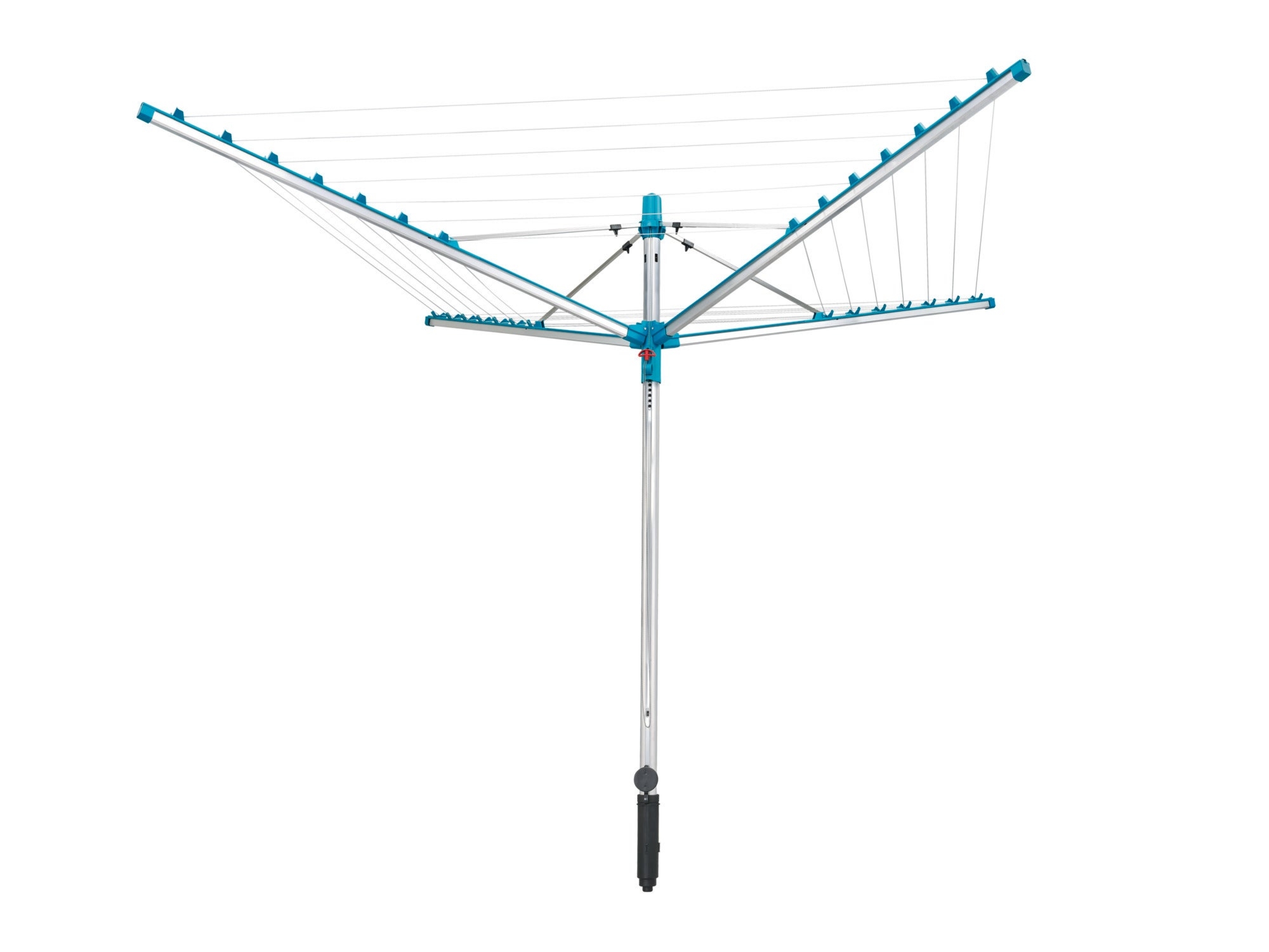 Suszarka Linomatic 400 Easy marki Leifheit posiada wielokrotnie sprawdzony mechanizm wciągający linki oraz lekką i otwartą konstrukcję w subtelnym, turkusowym kolorze. Tak jak we wszystkich suszarkach Linomatic, linki są schowane w ramionach, które chronią je przed zabrudzeniem – czyste linki, czyste pranie! Dzięki systemowi Easy Lift suszarka ogrodowa bardzo łatwo się rozkłada, a Ty oszczędzasz do 40% sił w porównaniu z innymi suszarkami ogrodowymi. Wystarczy pociągnąć za sznurek, aby napiąć linki. Linki są wciągane podczas składania tej suszarki ogrodowej i dzięki temu są zawsze suche i czyste. Dzięki małym zapadkom linki będą wciąż mocno napięte nawet po wielu latach użytkowania suszarki.
