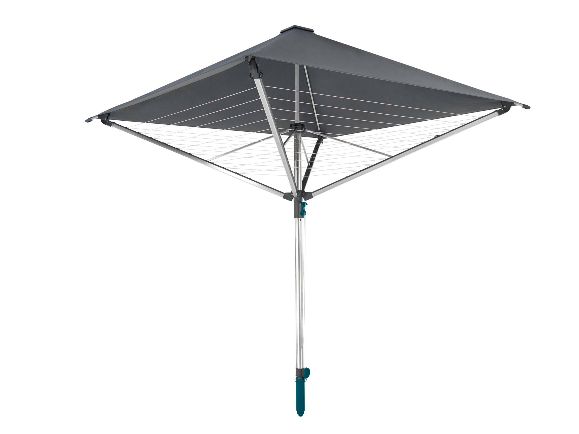 Suszarka ogrodowa LinoProtect 400 umożliwia jednoczesne rozwieszenie prania z 4 wsadów pralki. Łączna długość linek to 40 m, przekątna suszarki to 2,94 m, natomiast zewnętrzna linka ma długość 1,59 m, suszarka nada się więc świetnie również do małego ogrodu. Solidna konstrukcja oraz mechanizm zapobiegający wyrwaniu suszarki z podłoża zapewniają ochronę przed intensywnym wiatrem. Design parasola sprawia, że model LinoProtect 400 marki Leifheit dobrze wkomponuje się w każdy ogród. Dodatkowo, LinoProtect 400 posiada 8 praktycznych uchwytów na wieszaki, pozwalających suszyć ubrania bez zagnieceń. W zestawie jest również podstawa ogrodowa do zabetonowania. Dzięki LinoProtect 400 marki Leifheit pranie będzie pachnieć świeżością jeszcze dłużej, a suszenia nie przerwie żaden deszcz. Suszarka została wyprodukowana w Europie.