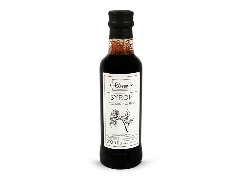 Naturalny, pasteryzowany sok z czarnego bzu, zawiera jedynie naturalne składniki z dodatkiem cukru i soku z cytryny.