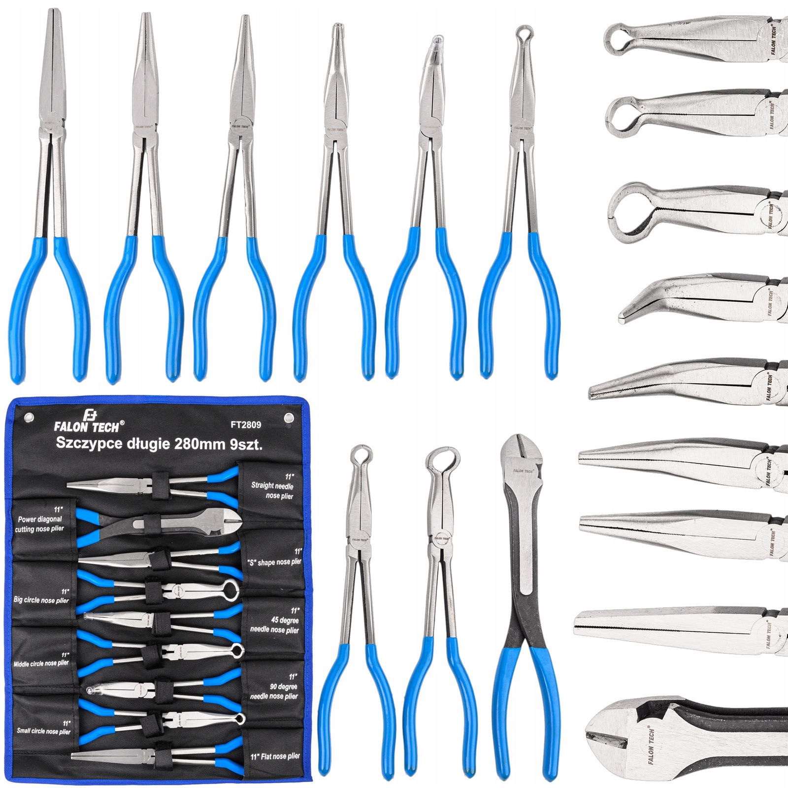 Zestaw 9 szczypiec długich 280 mm, proste, płaskie, zakrzywione, obcinaczki, do przewodów zapłonowych, o nachyleniu 90 ° - 0 ° - 20 ° - 45 °.