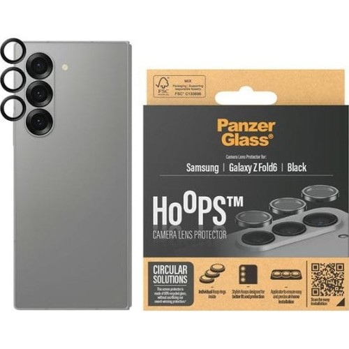 PanzerGlass Hoops Camera Lens Protector Samsung Galaxy Z Fold6   Zdjęcia bez skazy Z zarysowanym obiektywem nie ma żartów, są za to trwałe blizny na każdym zdjęciu. Jak temu zapobiec? Z oryginalnymi kółeczkami na aparat ze szkła hartowanego i aluminium duńskiej marki PanzerGlass z serii Hoops! Osłona pozwoli Ci zachować doskonałą jakość zdjęć i filmów, a dzięki odporności na wstrząsy i zarysowania, spotkanie z ostrymi kluczami czy krawędzią stołu niebezpiecznie zbliżającą się do telefonu nie robi na niej wrażenia. UWAGA: To są indywidualne pierścienie na obiektywy, produkt nie obejmuje całej wyspy aparatu. Przedmiotem sprzedaży jest sama ochrona obiektywu z zestawem aplikacyjnym, pozostałe akcesoria widoczne na zdjęciach służą jedynie przedstawieniu jego funkcjonalności.   Perfekcyjne za każdym razem Boisz się, że po aplikacji lensy całkowicie przejmą kontrolę nad Twoim aparatem, a telefon zapomni, jak się robi zdjęcia? Nic z tych rzeczy, Hoops, oprócz trwałej ochrony, nie wpływa na jakość i jasność wykonywanych zdjęć, a dzięki powłoce oleofobowej, która zapobiega powstawaniu smug i pozostawianiu odcisków palców, nie będziesz musiał maniakalnie wycierać soczewek co 10 minut.   Montaż na klik Nie pękaj, bo aplikacja szkła jest banalnie prosta! Jak zrobić i się nie narobić - krok po kroku: 1. Za pomocą najpierw mokrej, a potem suchej ściereczki, oczyść powierzchnię wyspy aparatu. Ewentualne pyłki usuń za pomocą naklejki antykurzowej. 2. Odklej warstwę ochronną z aplikatora. 3. Dopasuj szkło do wyspy aparatu. 4. Dociśnij, aż kliknie i zdejmij aplikator.     Co w środku? W zestawie PanzerGlass Hoops, oprócz 1 zestawu lensów, znajduje się też naklejka antykurzowa (01) i sucha ściereczka z mikrofibry (02). Opakowanie jest certyfikowane FSC, czyli można je poddać recyklingowi!