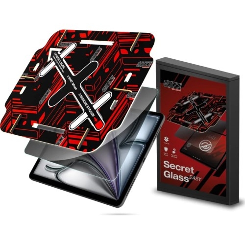 Grizz SecretGlass Easy Apple iPad Air 11" M2 6 gen, 2024 (A2902, A2903, A2904) Zadbaj o swoją prywatność Zwiększ swoją prywatność i zabezpiecz swoje sekrety w postaci wrażliwych danych, czy też wiadomości podczas korzystania z Grizz SecretGlass Easy. To szkło prywatyzujące jest połączeniem szkła i folii z warstwą ceramiczną, które nie pęka i nie kruszy się oraz wzmacnia wyświetlacz 6-krotnie bardziej od zwykłej folii, czy też szkła hartowanego.Uwaga! Warstwa prywatyzująca może zakłócać prawidłową pracę czytnika linii papilarnych w ekranie. Przedmiotem sprzedaży jest szkło prywatyzujące z zestawem aplikacyjnym, pozostałe akcesoria widoczne na zdjęciach służą jedynie przedstawieniu jego funkcjonalności. Wymiary szkła Podstawowym akcesorium do ochrony urządzenia mobilnego oprócz szkła jest etui. Aby upewnić się, że szkło będzie zgodne z etui należy pamiętać, że: wymiary szkła muszą być mniejsze od wymiarów wewnętrznych pokrowca futerał nie może nachodzić na szybkę Wymiary szkła: 23,97 x 17,07 cm (długość - szerokość) Idealnie dopasowane do ekranu tabletu Zapomnij o podglądaniu ekranu osób z boku na dobre. Technologia laserowa użyta w produkcji szkła zapewnia idealne wycięcia, aby dopasować je do wyświetlacza i uniknąć powstawaniu zapowietrzeń przy krawędziach tabletu, i stać się zarazem praktycznie niewidocznym szkłem na urządzeniu. *Zdjęcie poglądowe Wysoka ochrona z dodatkową warstwą oleofobową Szkło prywatyzujące Grizz skutecznie ochroni Twój tablet przed zarysowaniami i uderzeniami wzmacniając jego ekran o 600%. Warstwa oleofobowa minimalizuje powstawanie odcisków palców i tłustych smug. Zwiększa ona również komfort użytkowania tabletu, nie zmniejszając tym samym czułości ekranu na dotyk oraz pozostawiając poślizg palca bez zmian. *Zdjęcie poglądowe Łatwy montaż Instrukcja montażu: Wyczyść dokładnie ekran za pomocą dołączonych ściereczek, a pozostały kurz usuń za pomocą DustStix. Zdejmij warstwę zabezpieczającą "START" i obróć ramkę montażową tak, aby strzałka na naklejce wskazywała na lewy górny róg urządzenia. Wypozycjonuj szkło do powierzchni ekranu sugerując się strzałkami i nałóż ramkę równolegle do ekranu urządzenia. Przesuń palcem od lewego górnego do prawego dolnego rogu z odpowiednim dociśnięciem folii pod naklejką, trzymaj przez 30 sekund i usuń naklejkę. Dociśnij folię do wyświetlacza i równolegle zdejmij ramkę z urządzenia, a następnie usuń warstwę zabezpieczającą, pociągając listek z napisem "FINISH" jak najbardziej płasko w stosunku do folii. Wykorzystaj trójkątny element w celu usunięcia powstałych bąbelków powietrza, kierując się do najbliższej krawędzi urządzenia, a wszelkie ślady powietrza wchłoną się w ciągu 48h. W zestawie: szkło prywatyzujące Grizz SecretGlass ramka montażowa z ekologicznego materiału sucha i mokra ściereczka DustStix