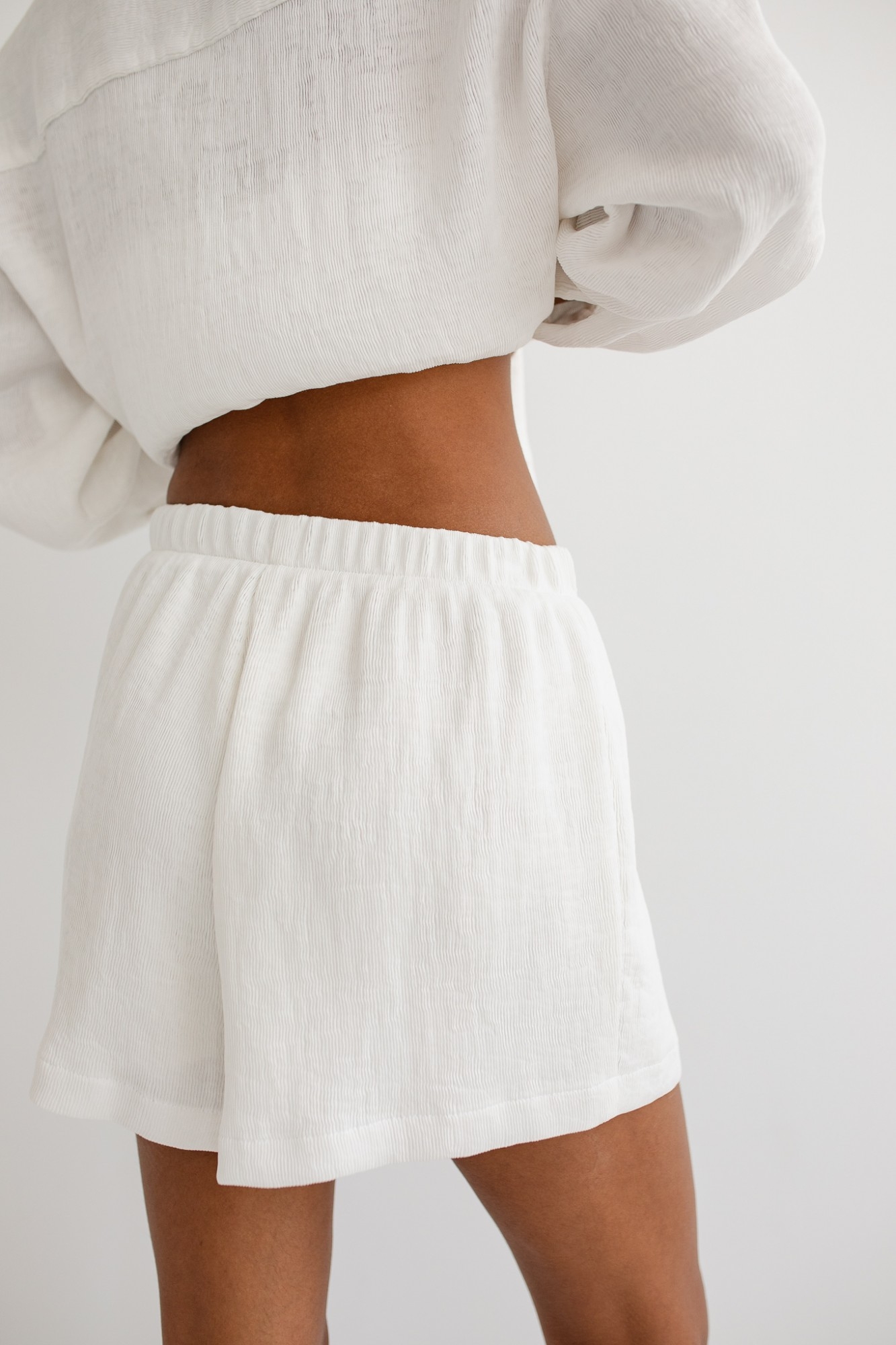 Szorty damskie wykonane z plisowanego materiału w kolorze złamanej bieli/ecru. Fason z luźniejszą, prostą nogawką. Spodenki mają nieco wyższy stan oraz gumę w pasie, co daje gwarancję wygody i umożliwia dopasowanie do wielu typów sylwetki. Zostały wykonane z niezwykle miękkiego plisowanego materiału - zapewniają wygodę i komfort nawet podczas upalnego lata. Posiadają podszewkę wykonaną z bawełny i wiskozy. Z przodu oraz z tyłu są zupełnie gładkie. Świetnie prezentują się ze zwiewnymi bluzkami/koszulami, czy dopasowanym topem. Stanowią bazę do wielu stylizacji. Komplet tworzą z koszulą NELLSON Dostępne również w kolorze jasnoniebieskim. Modelka ma 174 cm wzrostu i prezentuje rozmiar S Skład: 100% Poliester PRODUKT POLSKI - Marsala Collection ZALECANA PIELĘGNACJA: