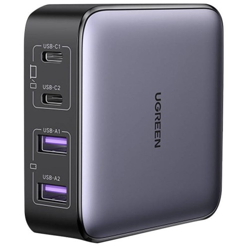 Ładowarka sieciowa Ugreen GaN 65W, CD226 Uniwersalna / 2x USB-C / 2x USB-A Kompaktowe bezpieczeństwo Ładowarka sieciowa UGREEN oferuje imponującą moc 65 W, umożliwiając szybkie ładowanie. Obsługuje różne protokoły szybkiego ładowania i umożliwia równoczesne podłączenie nawet czterech urządzeń. Dodatkowo, zapewnia wysoki poziom bezpieczeństwa dzięki szeregowi zabezpieczeń. Co więcej, jej kompaktowy rozmiar pozwala na przenoszenie jej praktycznie wszędzie. Stanowi ona idealne rozwiązanie do ładowania smartfonów, tabletów, konsoli, laptopów oraz wielu innych urządzeń, oferując obsługę popularnych protokołów szybkiego ładowania. Kolor producenta: Grey (szary) Zapomnij o długich godzinach ładowania Ładowarka UGREEN zapewni Ci błyskawiczne naładowanie urządzeń! Ten produkt obsługuje szybkie ładowanie zgodne ze standardami Power Delivery, Quick Charge, FCP, AFC, SCP i BC 1.2. Co więcej, oferuje imponującą moc do 65 W. Dzięki temu możesz naładować baterię iPhone'a 14 do 50% w zaledwie 27 minut lub MacBooka Air w 45 minut! (dane szacunkowe) Ilość portów: 4 Rodzaj portów: 2 x USB typu C, 2 x USB typu A Moc całkowita: 65 W Moc wyjściowa USB typu C: 65 W max. Moc wyjściowa USB typu A: 22,5 W max. Rodzaj wtyczki EU Naładuj każde urządzenie Model CD327 został wyposażony w cztery porty - dwa porty USB-C i dwa porty USB-A, co pozwala na równoczesne ładowanie wielu urządzeń bez przeszkód. Ładowarka ta wyróżnia się także szeroką kompatybilnością, umożliwiając bezproblemowe naładowanie smartfonów (Apple, Huawei, Samsung, Xiaomi), tabletów Apple oraz laptopów. Protokoły szybkiego ładowania: PD 3.0, PPS, QC 4.0, SCP, FCP, AFC, BC 1.2 Maksymalne obciążenie mocy wynosi do 65W. Parametry wyjściowe: USB-C 1 / 2: 5V / 3A, 9V / 3A, 12V / 3A, 15V / 3A, 20V / 3.25A, PPS: 3.3-21V / 3A, 65 W Max USB-A 1 / 2: 5V / 3A, 9V / 2A, 12V / 1.5A, 10V / 2.25A, 22.5 W Max Moc wejściowa: AC 100-240 V~, 50/60 Hz, 1,8A maks. Wielopoziomowa ochrona Urządzenie zostało oparte na zaawansowanej technologii GaN II, co przekłada się na znaczną poprawę efektywności ładowania. Dzięki temu rozwiązaniu, urządzenie charakteryzuje się niską temperaturą podczas pracy oraz wykorzystuje mniejszą ilość energii. Ładowarka ta posiada wielopoziomową ochronę, zapewniając najwyższy poziom bezpieczeństwa. Chroni ona przed przepięciami, przegrzewaniem, przeciążeniem oraz krótkimi spięciami.