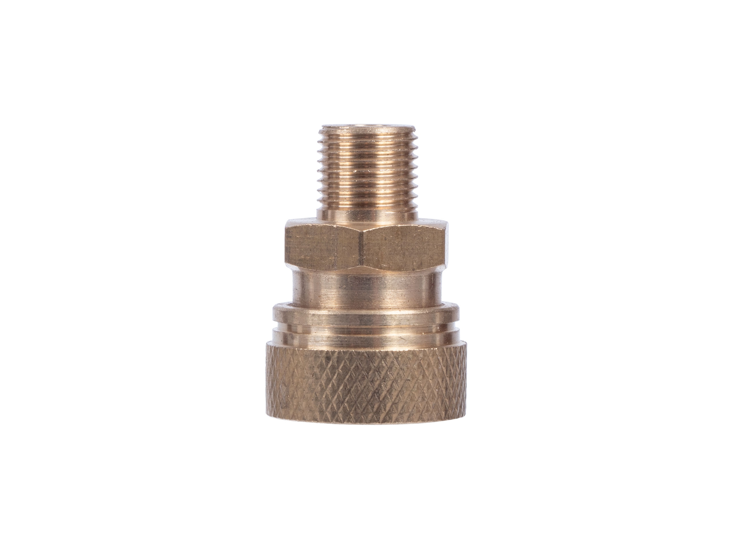 Mosiężna łączka ma zakończenie Quick Disconnect oraz uniwersalny gwint 1/8" BSP do bezpośredniego podpinania butli hp lub pompki.