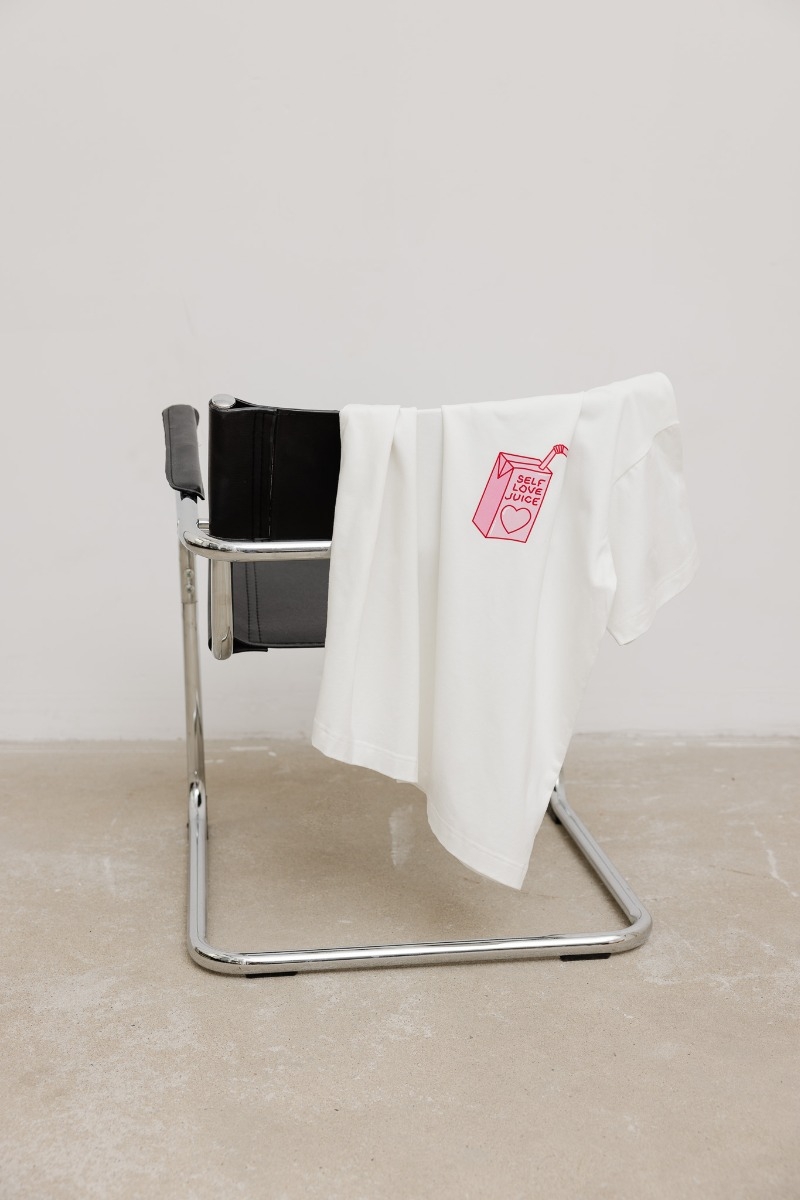 Klasyczny t shirt w kolorze ecru, z grafiką i napisem SELF LOVE JUICE w kolorze różowym. Fason o prostym, pudełkowym kroju ze znacznie obniżoną linią ramion. Rękaw szeroki, przedłużony. Dekolt niewielki, okrągły . Luźna, inspirowana męską garderobą koszulka, która pasuje niemalże do każdego typu sylwetki. Dostępny również w innych kolorach. Skład: 95% Bawełna, 5% Elastan ZALECANA PIELĘGNACJA: