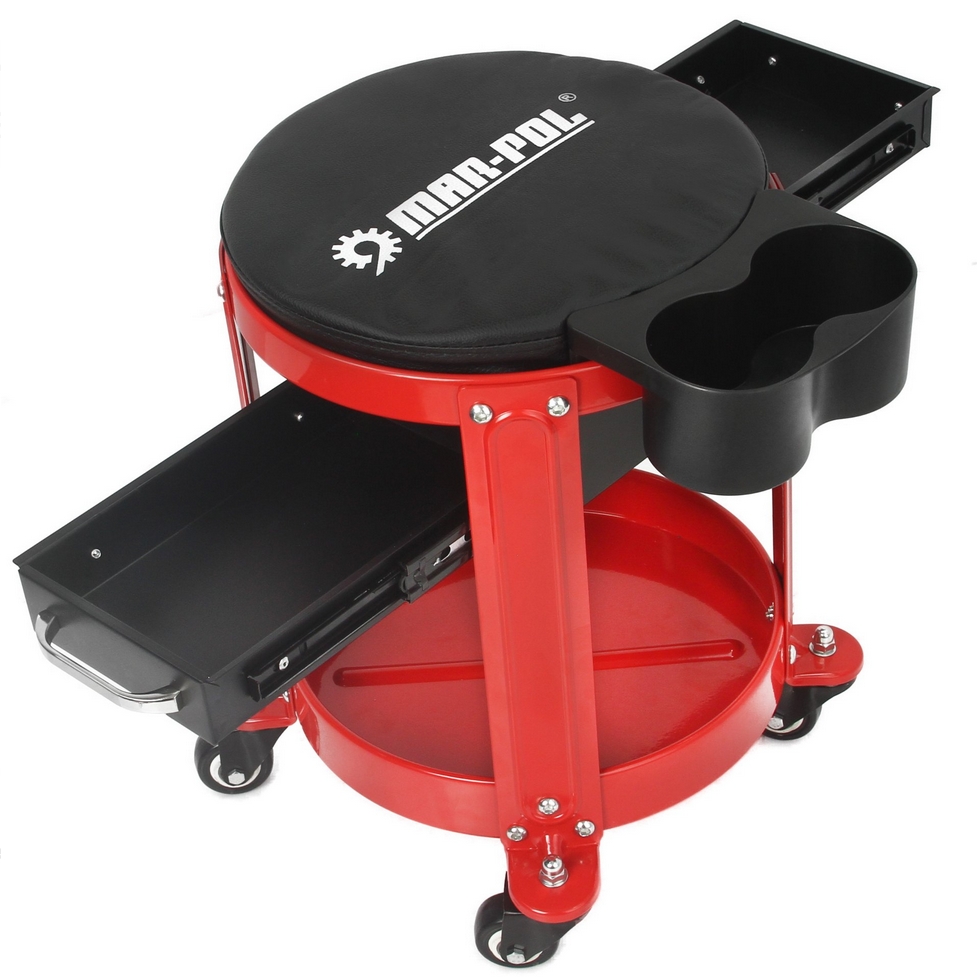 Niezwykle solidny taboret do wykorzystania w warsztatach, posiada miękkie, wygodne siedzisko , solidną metalową konstrukcję a także dwie wsuwane na prowadnicach szufladki wyposażone w uchwyty a także DODATKOWO GRATIS cupholder z miejscem na dwie butelki