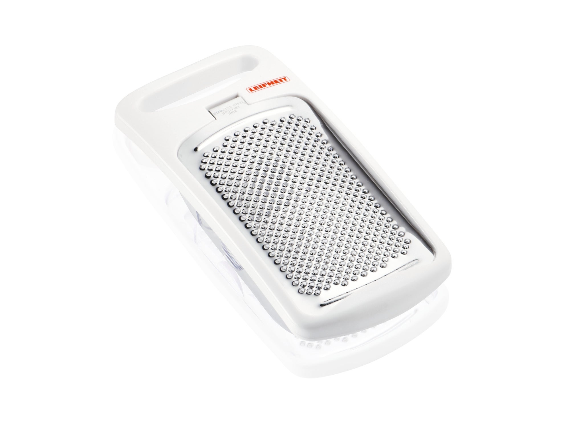 Tarka do gałki muszkatołowej marki Leifheit pozwoli nie tylko na błyskawiczne i dokładne starcie aromatycznej przyprawy, ale również umożliwi bezpieczne przechowanie produktu. Tarkę wykonano z hartowanej i nierdzewnej stali szlachetnej. Jej oczka zawsze pozostają ostre. Umieszczono ją w praktycznej, białej obudowie z wytrzymałego tworzywa sztucznego. Do tarki dołączony jest pojemnik, dzięki któremu wygodnie i bezpiecznie można przechować starty produkt i skorzystać z niego, kiedy tylko będzie potrzebny. Wygodną pracę gwarantuje poręczny uchwyt umieszczony na szczycie tarki.