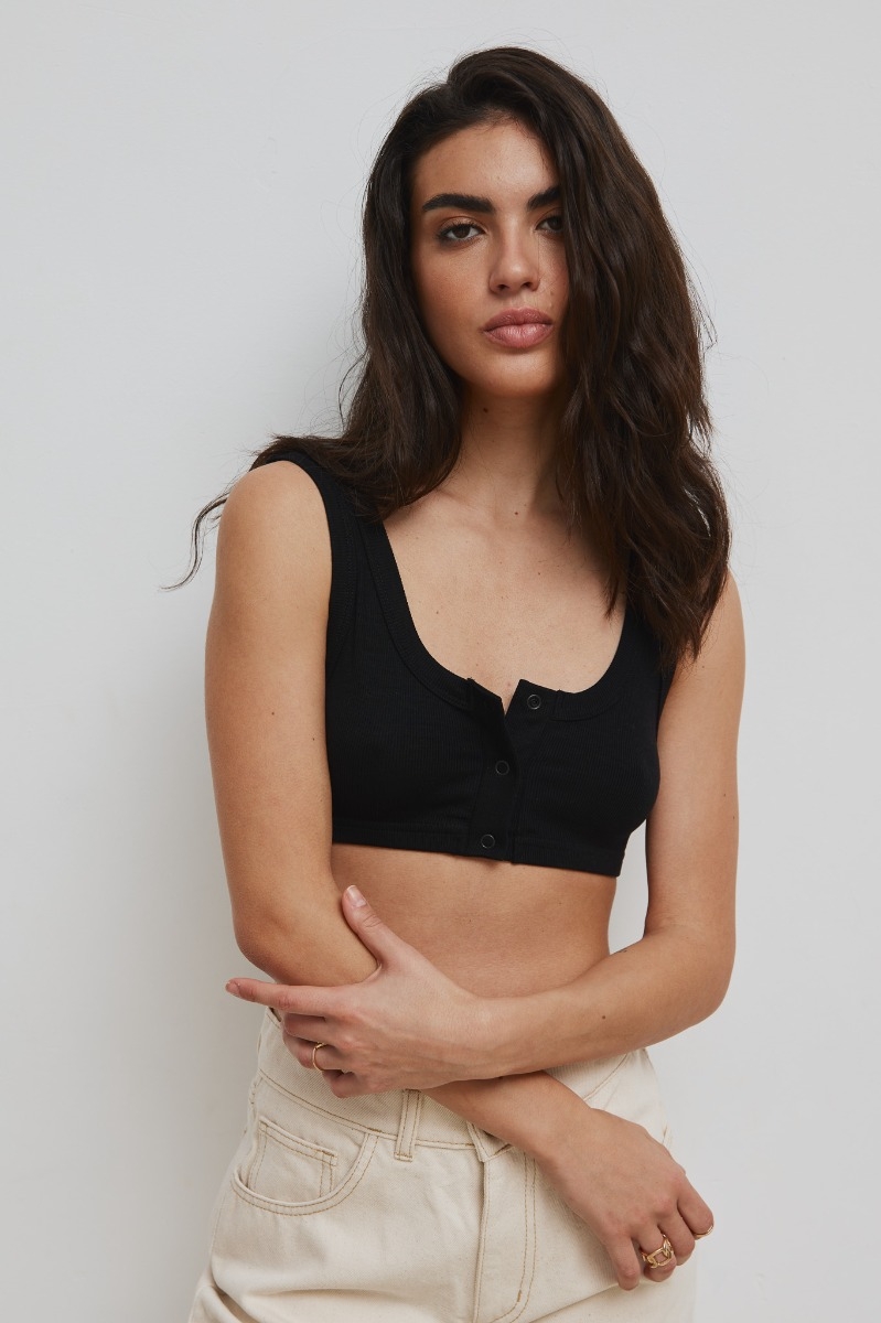 Top LILLE wykonany jest z miękkiej i elastycznej dzianiny prążkowanej, w KOLORZE CZARNYM. Posiada półokrągły dekolt i szersze ramiączka . Całość zapinana na napy wygodne napy z przodu . Jest to nie tylko funkcionalny ale i ozdobny element tego modelu . To idealny wybór na lato i cieplejsze dni. Dzięki swojemu kobiecemu fasonowi doskonale dopasowuje się do ciała, podkreślając atuty sylwetki. Mżna go swobodnie zestawić ze spódnicą lub szortami tworząc elegancki i stylowy zestaw. Niezwykle modna i komfortowa propozycja. Ten top zapewni Ci nie tylko wygodę, ale również świetny wygląd na każdą okazję. Skład : 95% Bawełna, 5% Elastan Gramatura dzianiny 250 g/ m² Zalecana pielęgnacja :