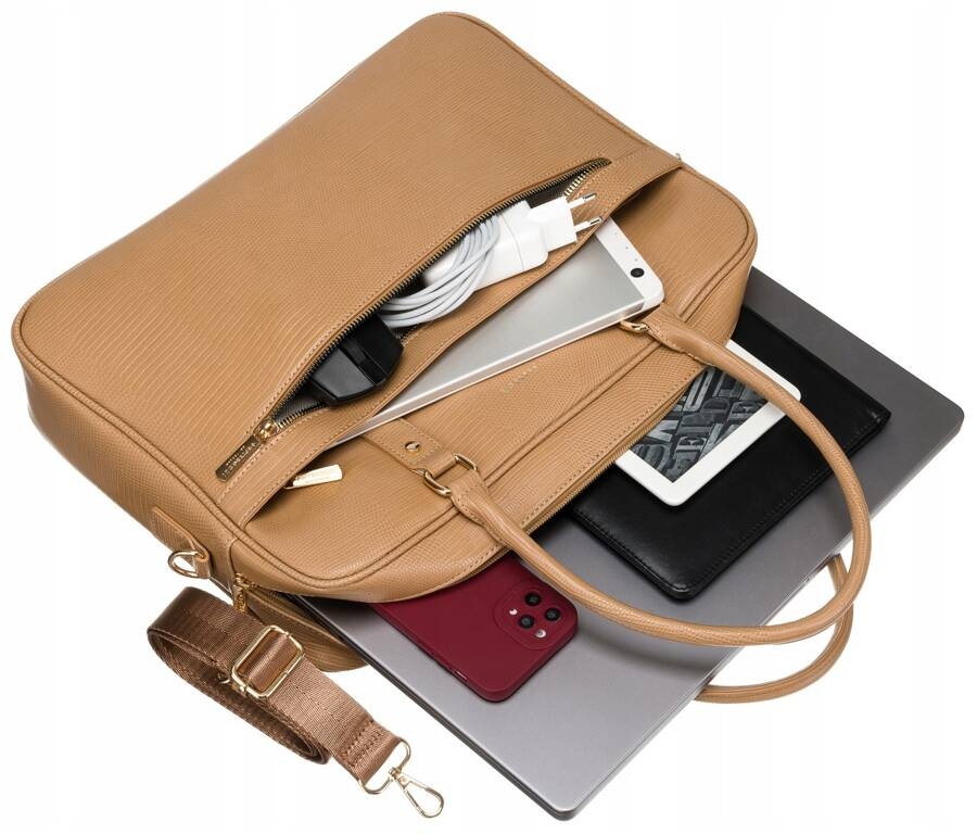 Pojemna i bardzo stylowa torba biznesowa. Mieści format A4. Wykonana ze skóry ekologicznej fakturowanej we wzór imitujący skórę węża. Posiada przegrodę na laptopa do 13,3". Wyposażona w doczepiany pasek i uchwyt na walizkę.